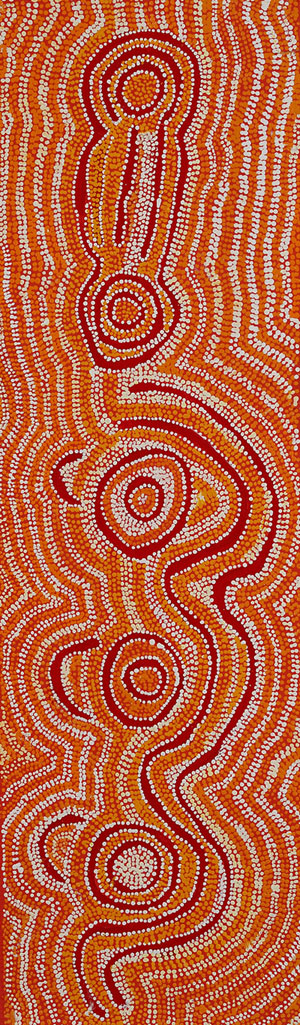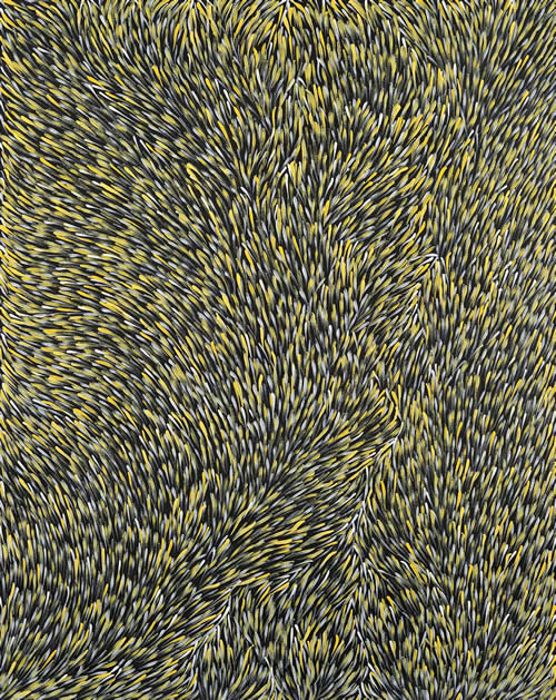Born at Watulka she was married to the late Yala Yala Gibbs Tjungurrayi with whom she moved to Papunya in the early days of the settlement. In 1996 Ningura began painting for Papunya Tula Artists in her own right. Her work show a strong dynamism and rich linear design created with heavy layers of paint. Her works adorns a ceiling within the Musee du Quai Branly in Paris. Australian Art Collector includes her in their list of the 50 most collectible Australian artists. Collections: National Gallery of Australia, Art Gallery of New South Wales, Australian Institute for Aboriginal and Torres Strait Islander Studies.