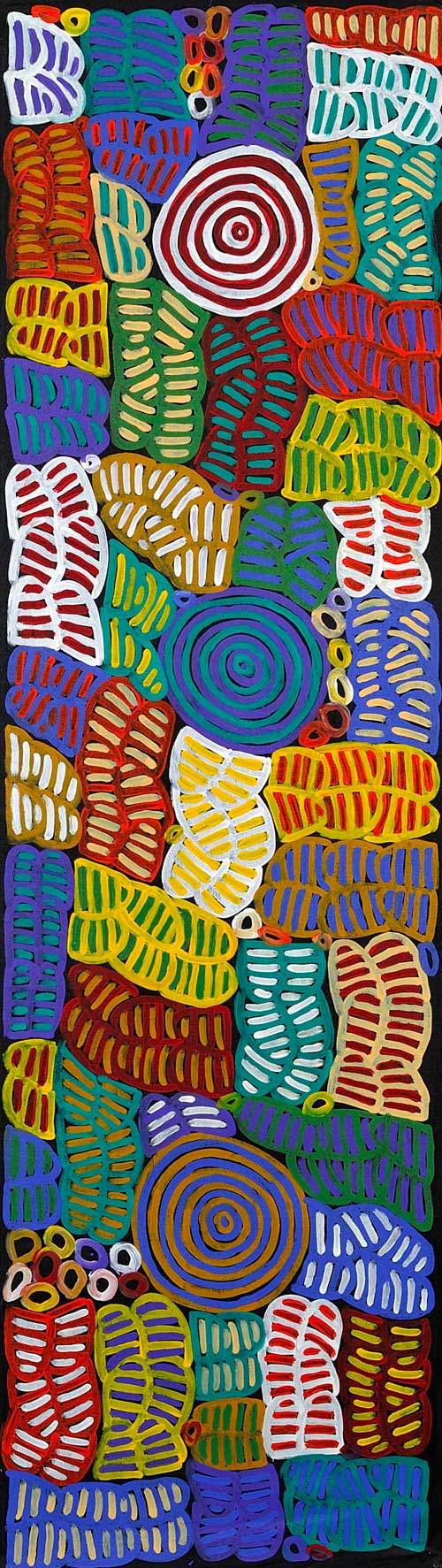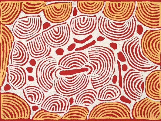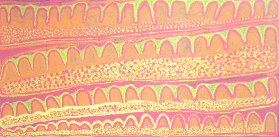 She paints her Grandfather's Country at Mt Singleton, Bush Tucker dreaming and The Root System with People Sitting. Peggy paints for Warlukurlangu Artists (Yuendumu) and was represented in the 2004 Desert Mob exhibition.